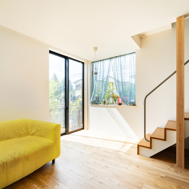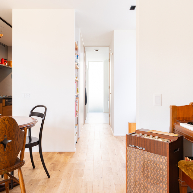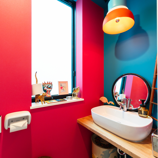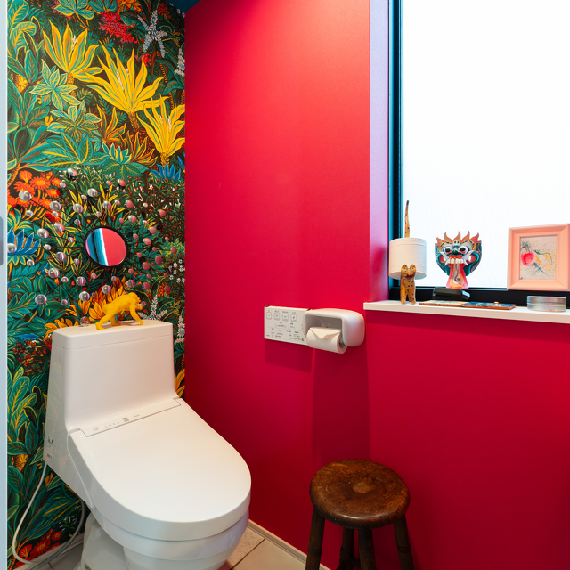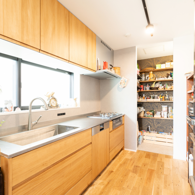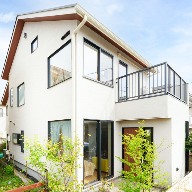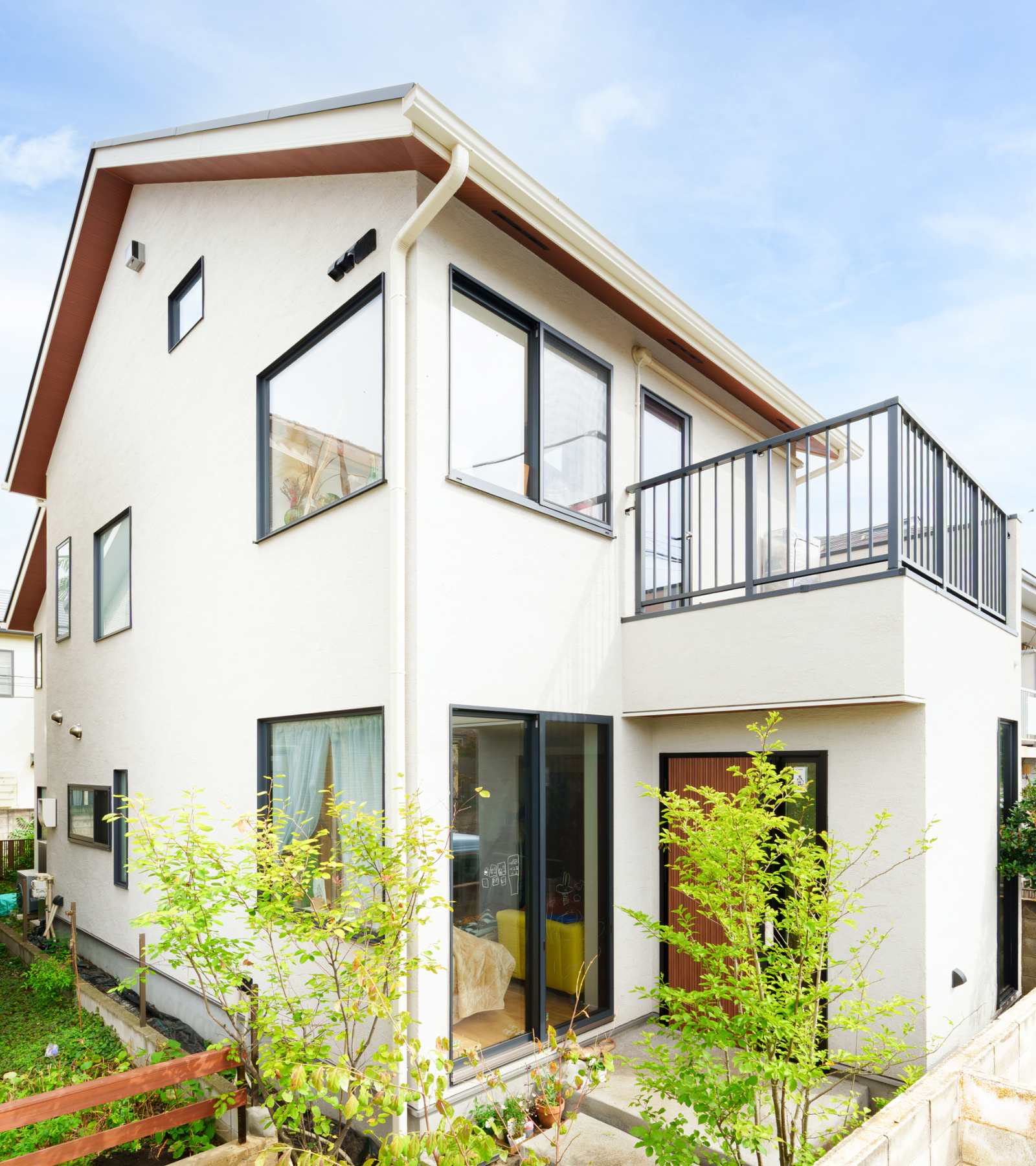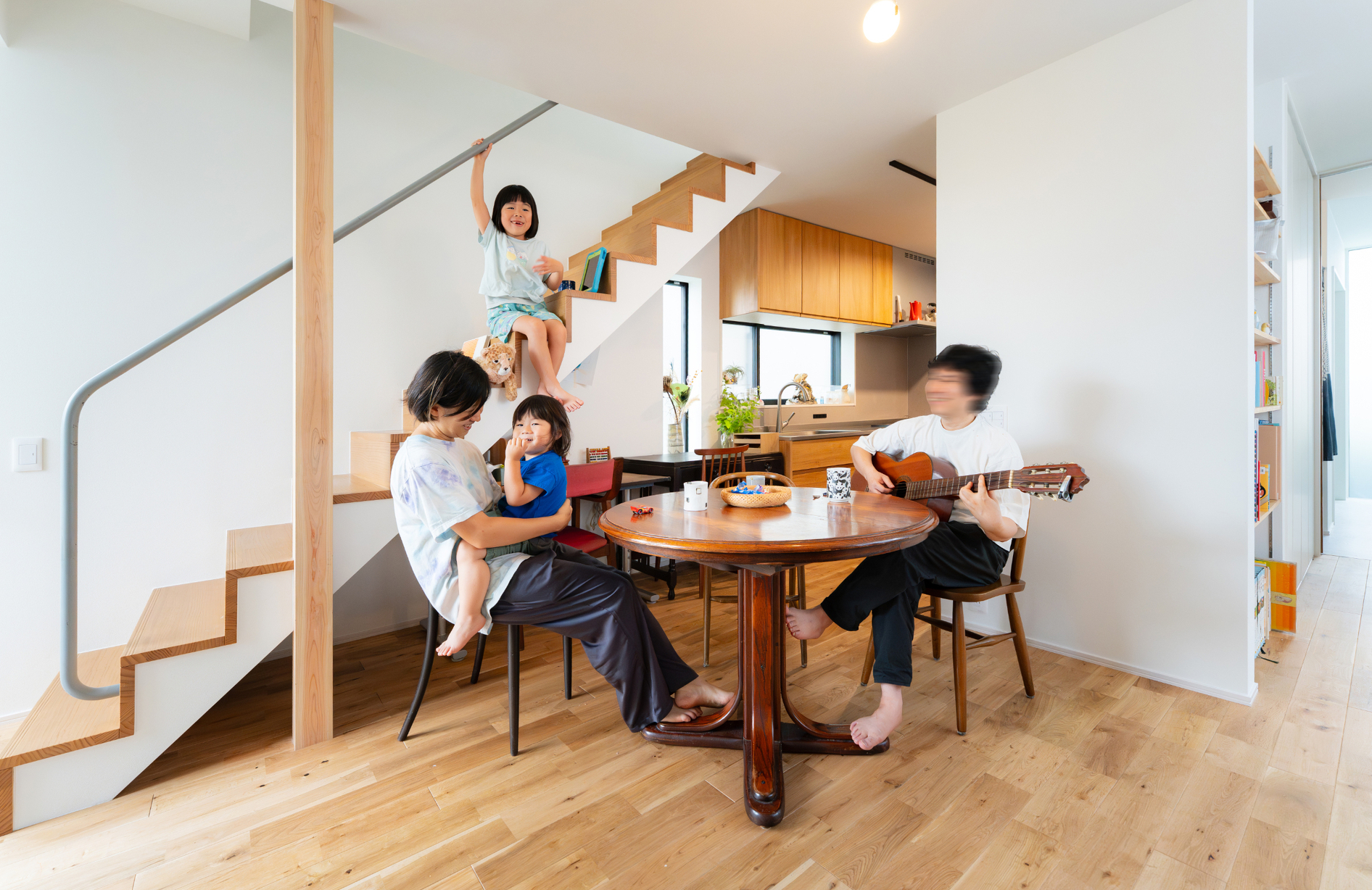 緑豊かでおだやかな住宅街に佇む、Tさんご家族のお住まい。のびのびと子育てができ、気兼ねなく暮らせる場所をと探してめぐりついたこの土地に、陽だまりとお気に入りの家具や雑貨、ご自身の作品に囲まれた、ほがらかなご家族にぴったりの明るく賑やかなマイホームを建てられました。