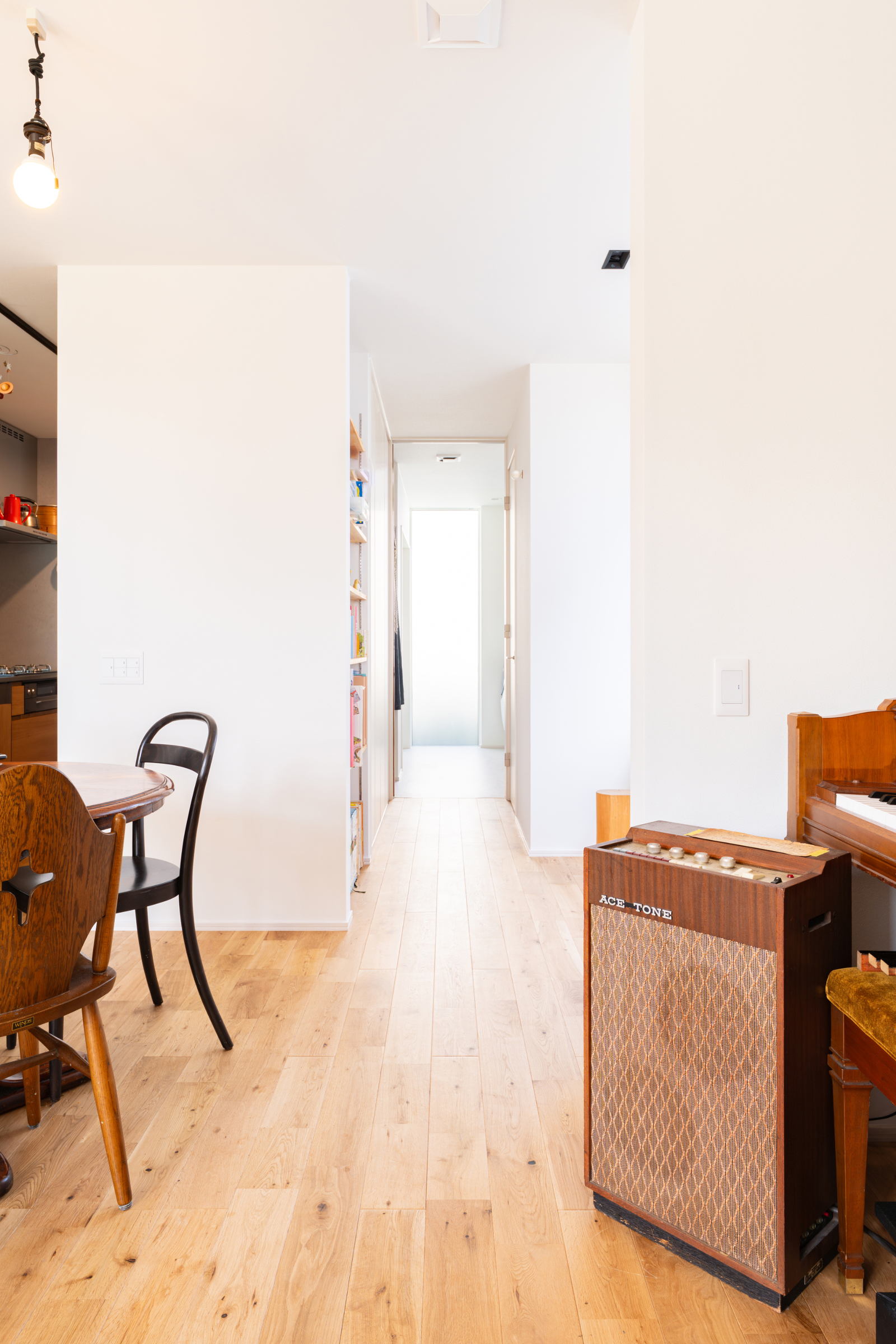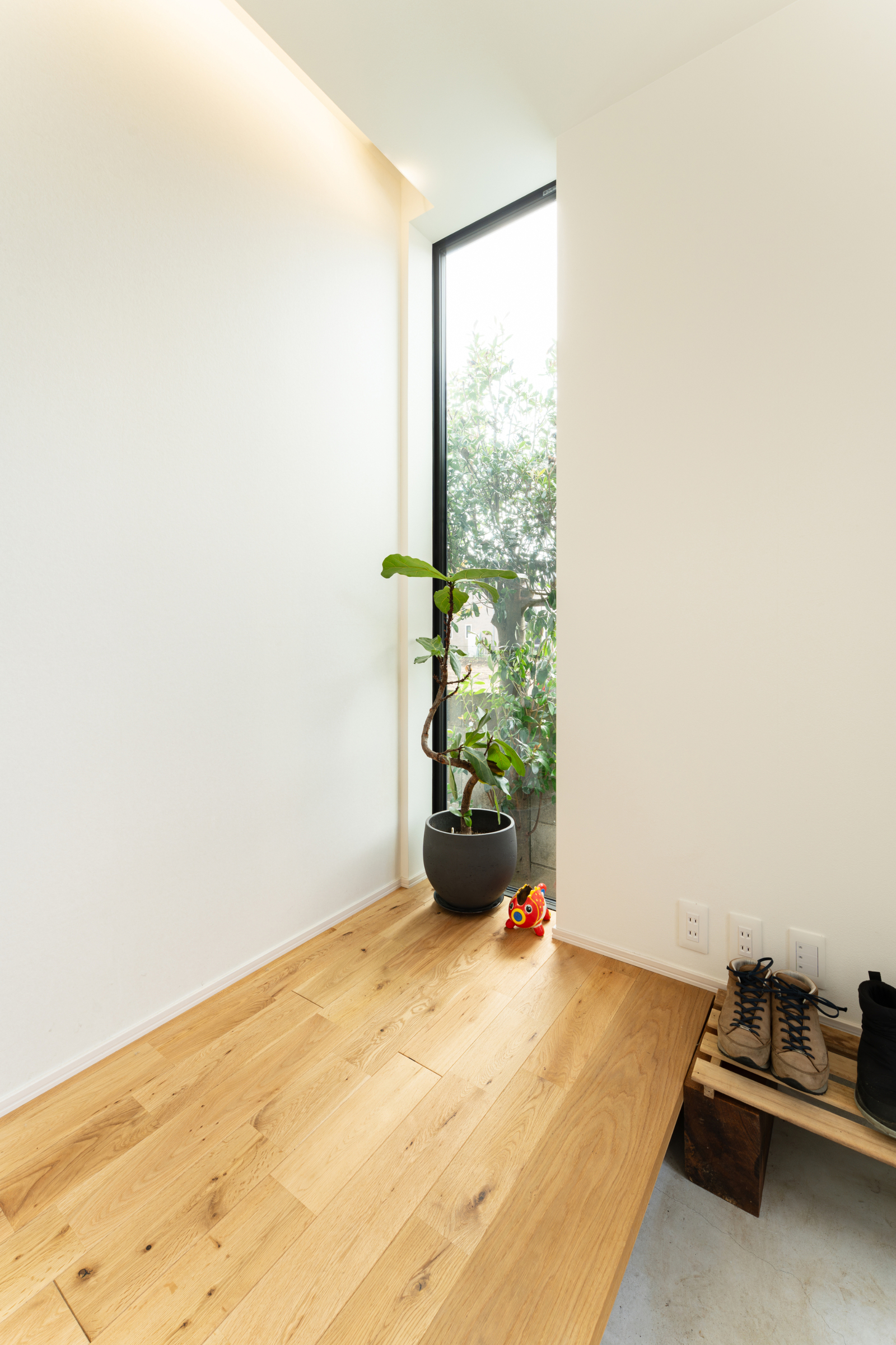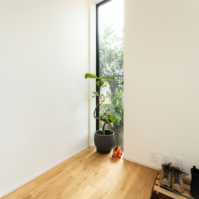 そんなご夫婦が家づくりでこだわられたのは、“一つひとつ確かめてつくる家”にすること。予算をかけるところと妥協するところ、いわゆるメリハリのあるプランにするのではなく、家中まんべんなく一定の基準値まで揃えることで、気に入らない所をいかに少なくしていくかを心掛けたそうです。例えば窓なら枠のデザインや断熱性の数値、床材なら木の種類や仕様、風合いなど、当社からの提案だけではなく、予算を見据えながらご自分たちで納得いくまで各種メーカーを調べ上げてひとつひとつ厳選。クリエイターらしい、妥協のないモノ作りの姿勢はさすがです。「どれもギリギリまで時間をかけて決めていきましたが、小嶋工務店さんは最後まで忍耐強く付き合ってくれました」と、当時を振り返られました。