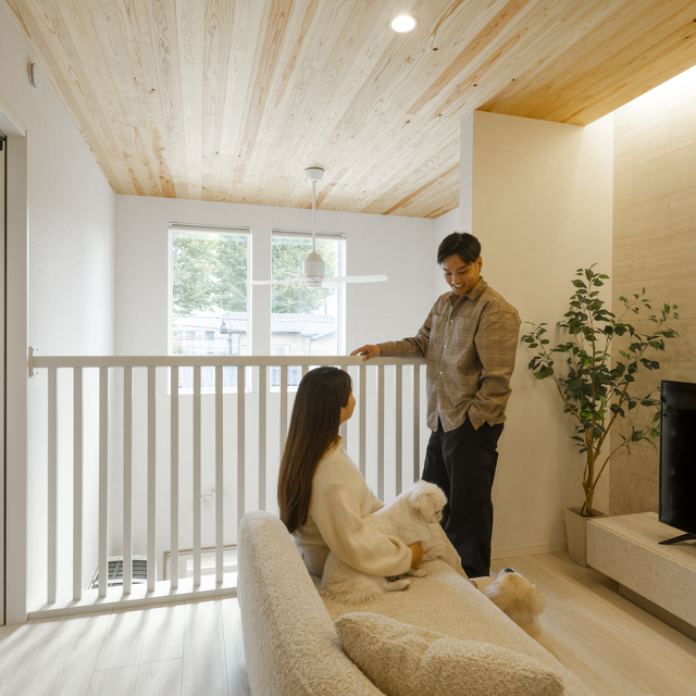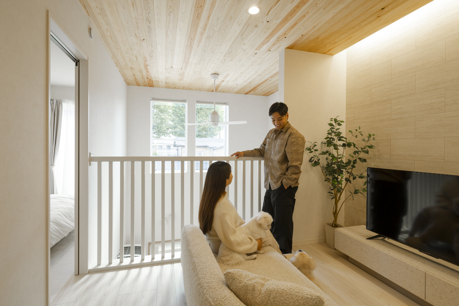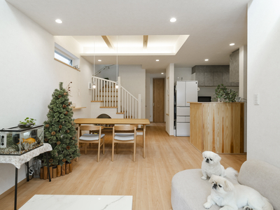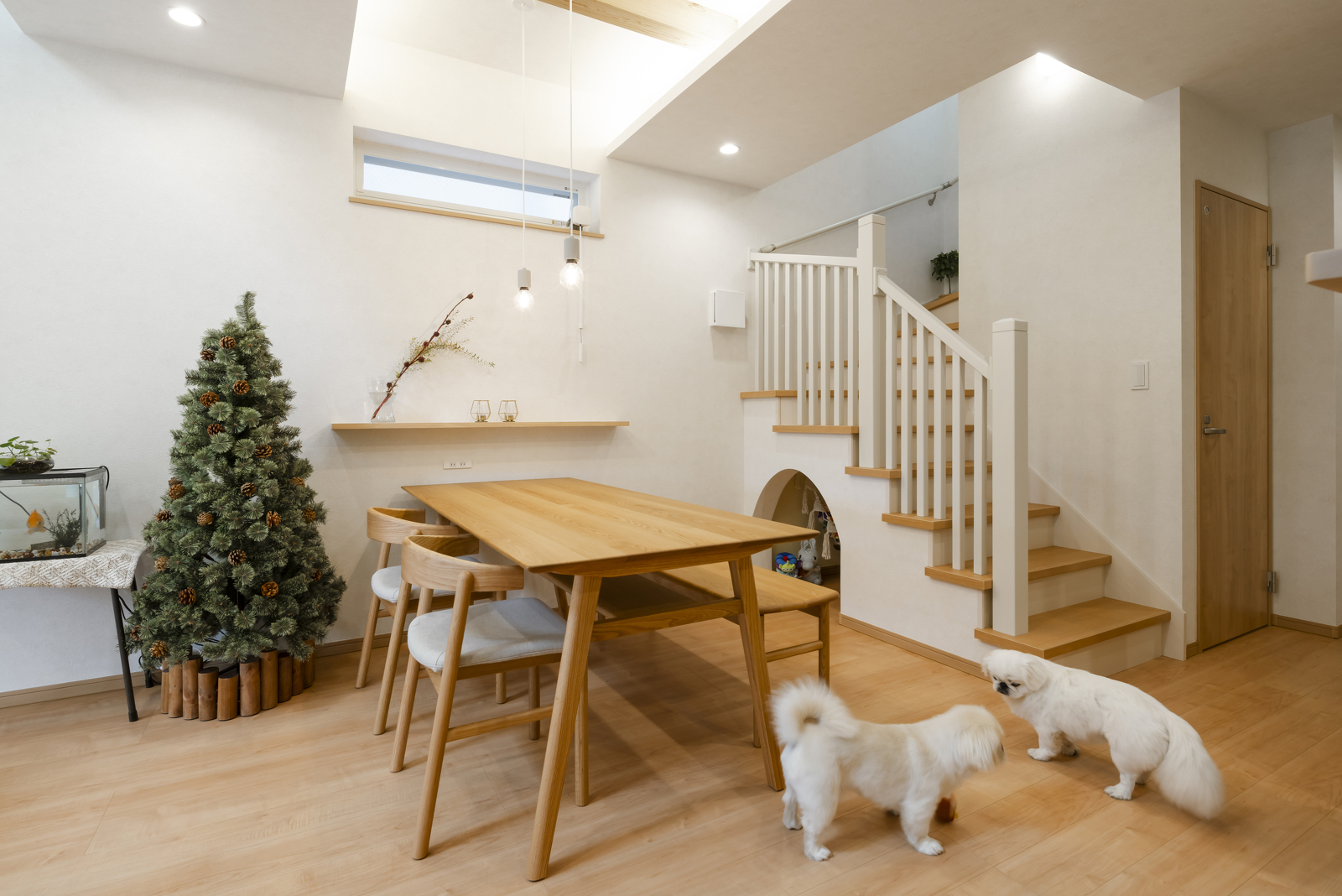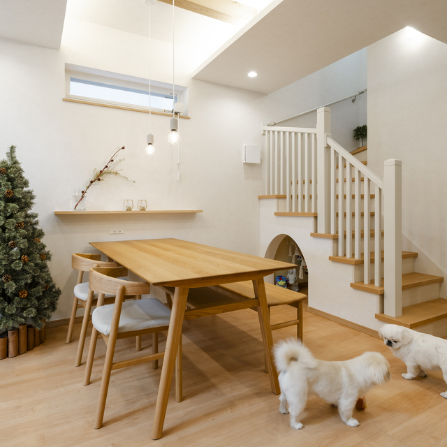さらに、TOKYO WOODの桧材に憧れたものの、愛犬を想い、床材は足腰に優しいペット専用のものを採用。階段下には小金井のモデルハウスを参考にした愛犬スペースを設けるなど、“ワンちゃんファースト”の家づくりにもこだわられ、愛犬も楽しく心地よく過ごせるお住まいを叶えました。
