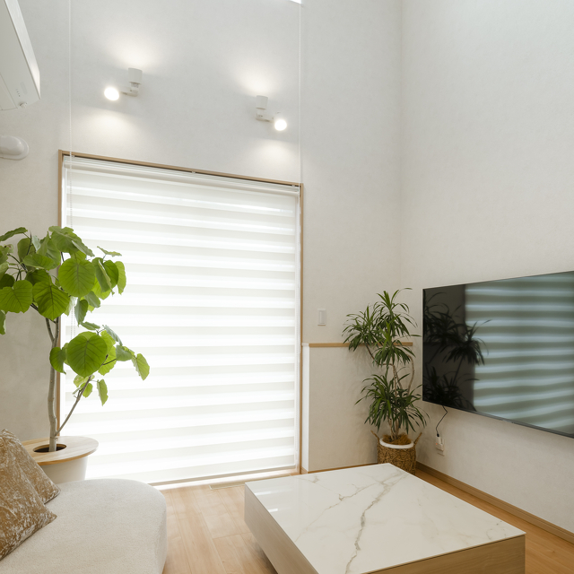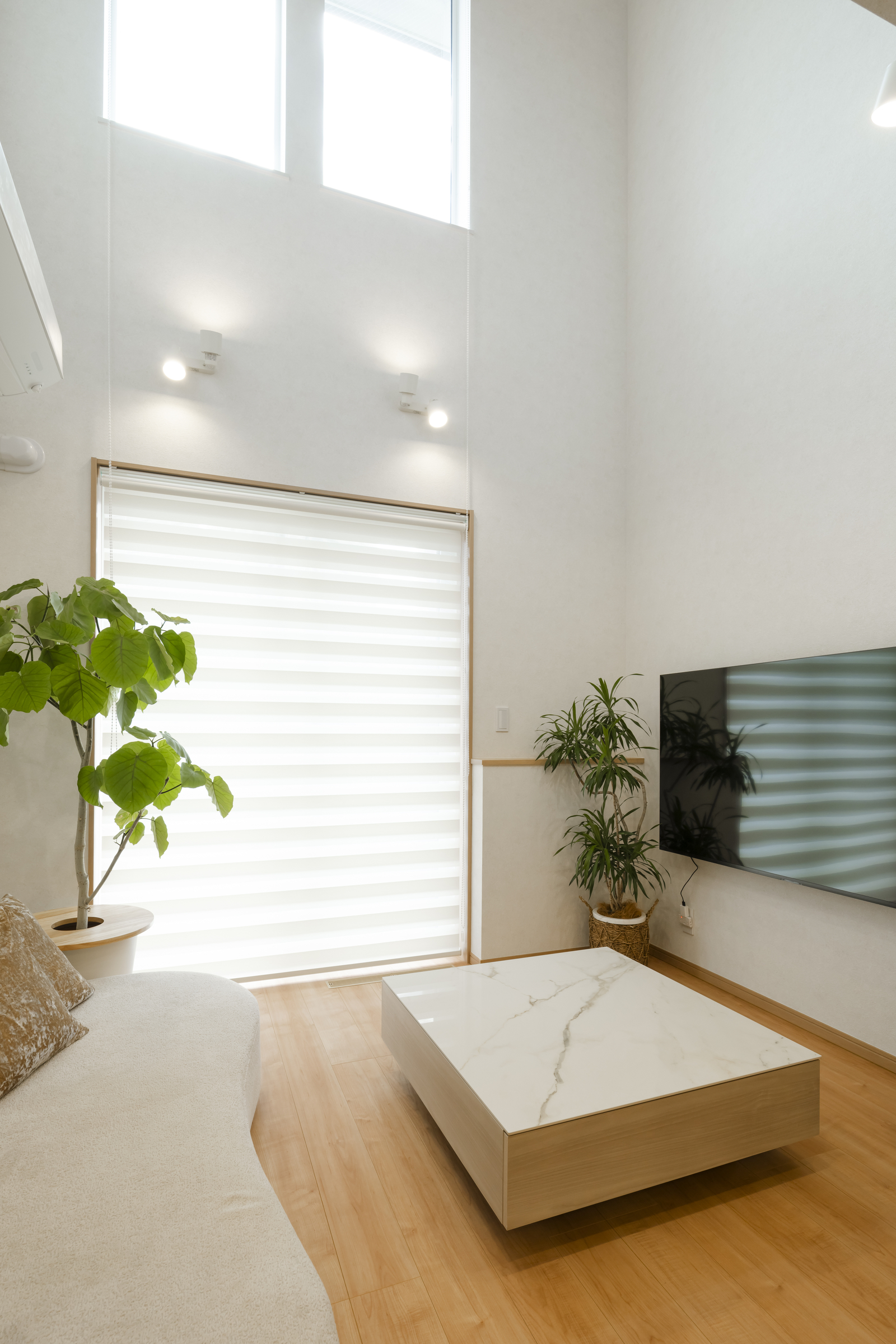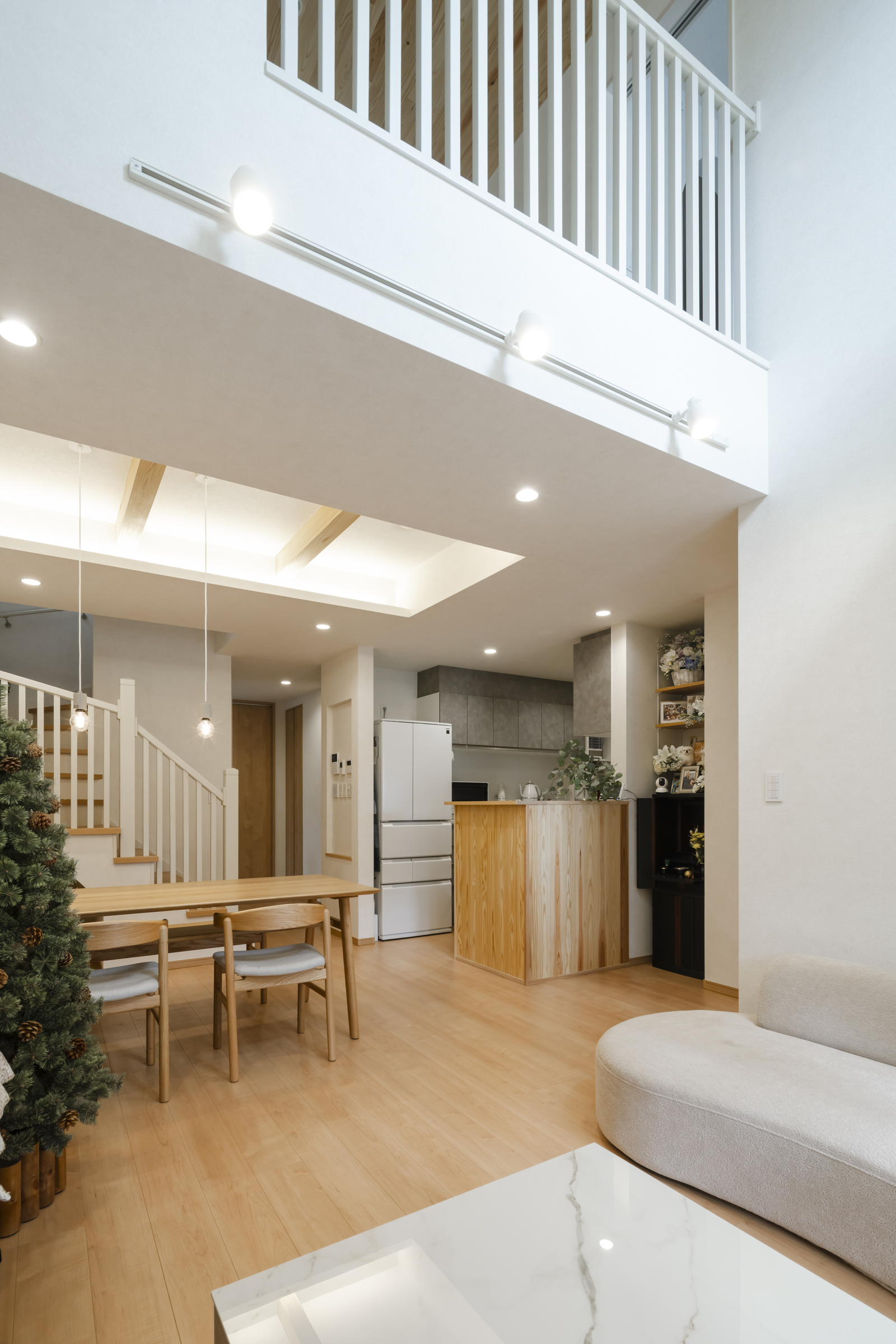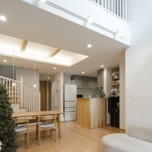 玄関や洗面室など、以前の慣れ親しんでいた配置を引き継ぎつつ、二世帯のご希望やこだわりをプラスして誕生したKさん邸。一番の魅力はなんといっても、ご家族と愛犬がゆったりとくつろげる、開放的なLDKでしょう。リビングには吹抜けとハイサイドライト、ウッドデッキとつながる大きな窓も配置し、明るさとよりいっそうの広がりを創出。「リビングのソファに座って、のんびりするのがいいですね」「天井が高くて、窓から庭や空まで見晴らせて、とても心地よいです」「ひとりで自由に過ごすこともできます」と、ご家族も口々に大絶賛。奥様と娘さんが中心となってコーディネートした、白と木目、ペールグレーを基調としたナチュラル&エレガントなインテリアも映える、皆さんお気に入りの場所になりました。