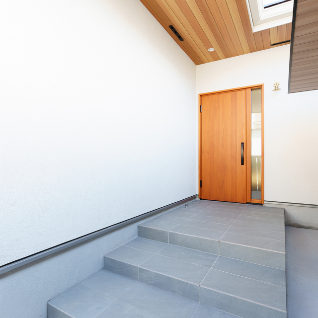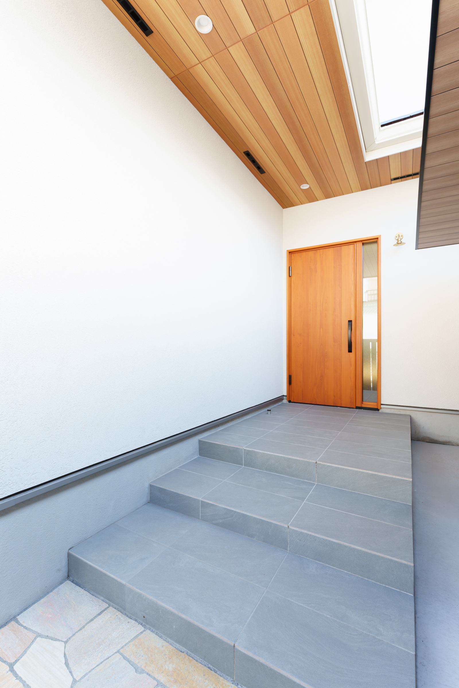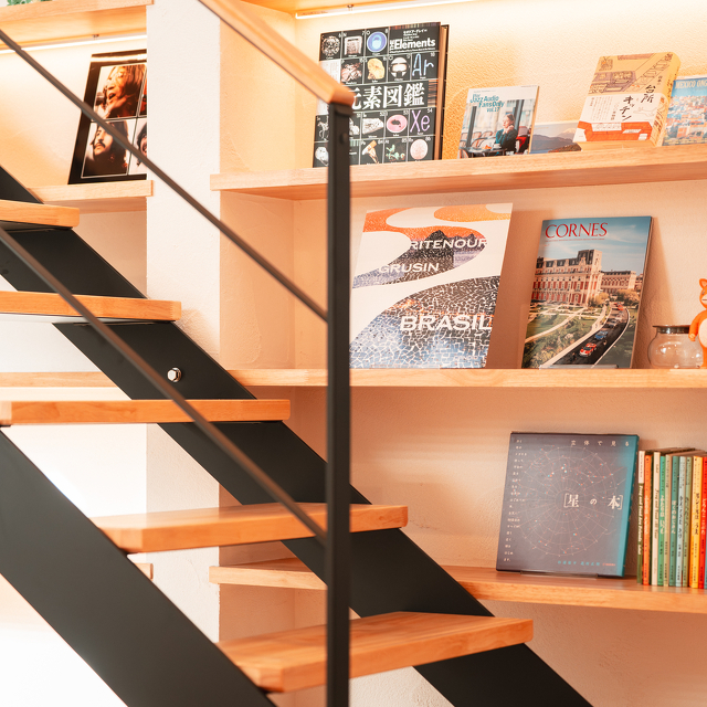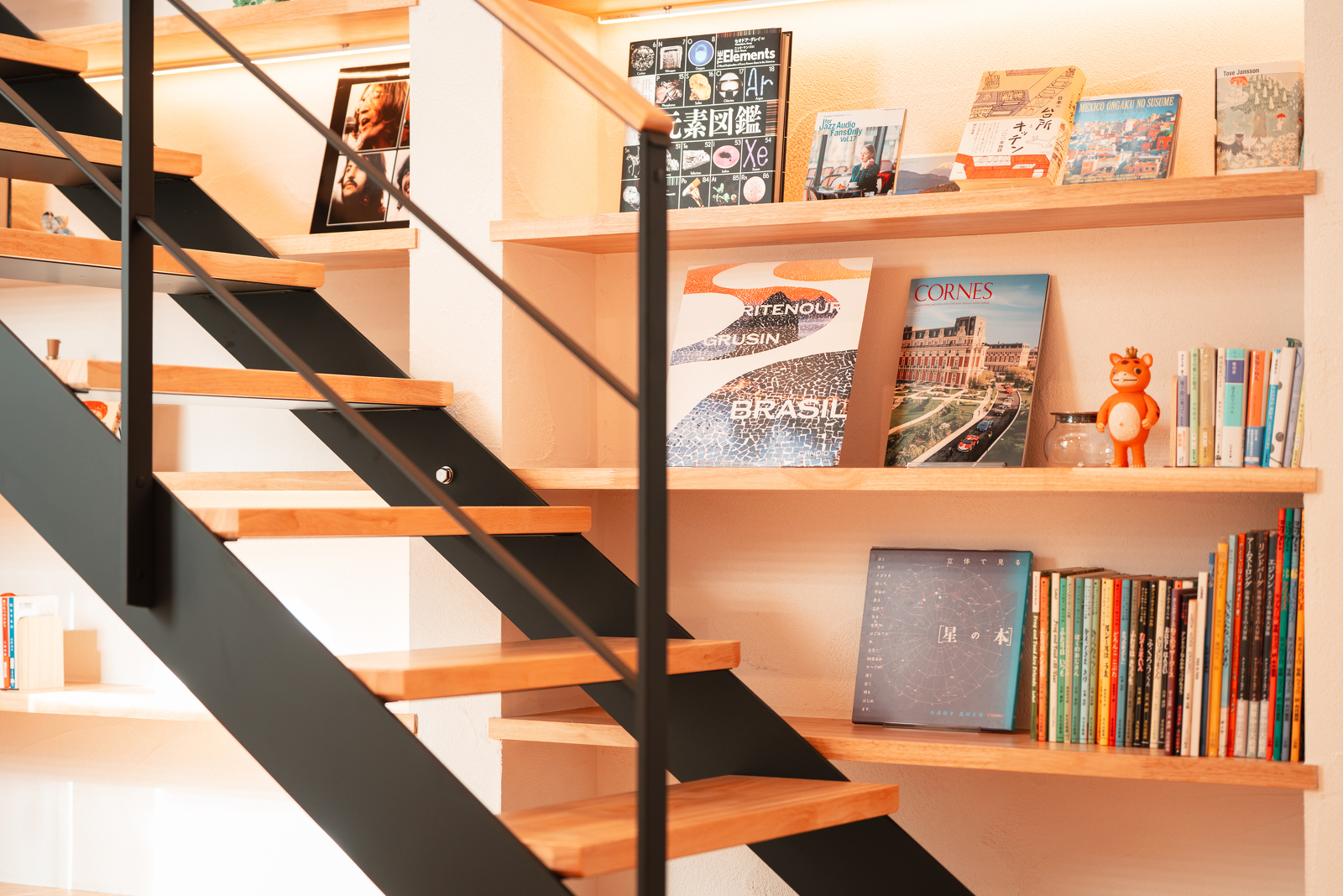 なかでも目を奪われるのが、玄関ドアを開けた瞬間に広がる大空間。玄関ホールとLDK、吹抜けのスケルトン階段が仕切りなくオープンにつながり、さらに中庭に面した大きな窓が視線を外へと誘い、内と内・内と外の境界が溶け合い一体となった開放感は、圧巻そのものです。「当初建築士さんから提案されたときは、玄関からLDKが丸見えになるのでは…と心配しましたが、中庭が程よい目隠しとなって気になりませんね」と、満足そうなご夫婦。おふたりが希望された壁一面の本棚もアクセントとして加わり、Yさん邸を象徴するダイナミックな空間設計となりました。