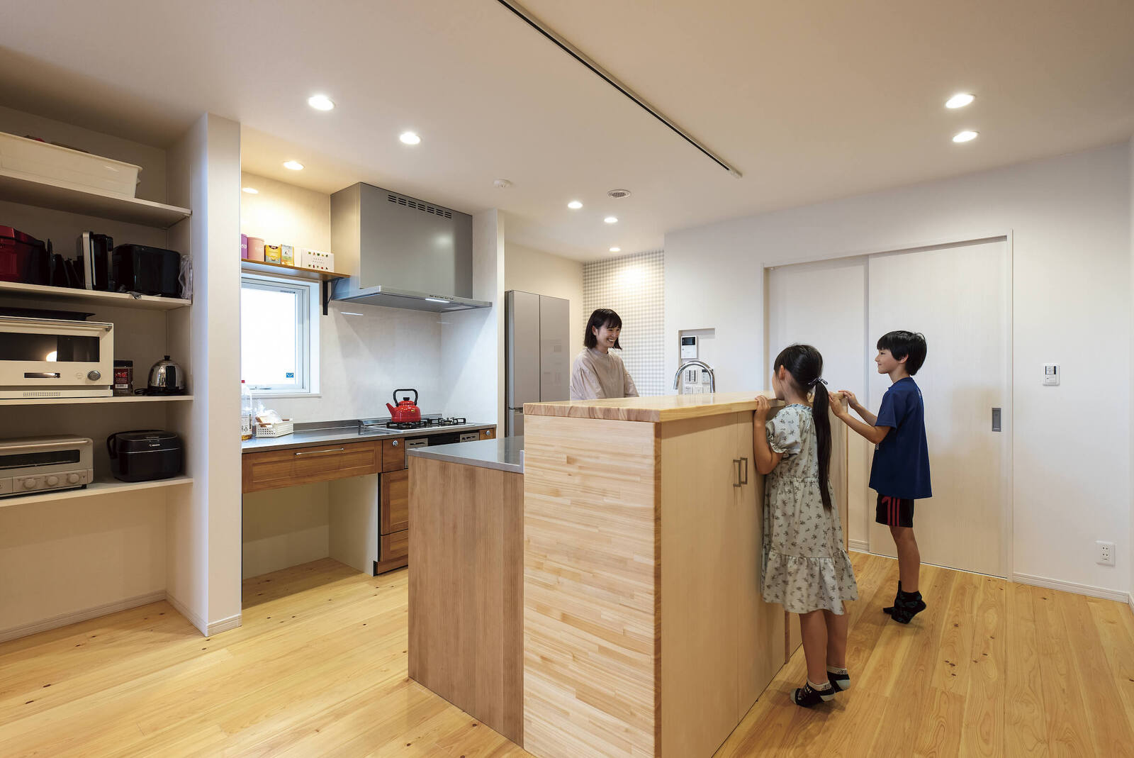 Kさん邸の一番の見どころは、吹き抜けの開放感と木のぬくもりいっぱいのLDK。床には『TOKYO WOOD』の無垢桧材をふんだんに採用し、外断熱との相乗効果で、さわやかな心地よい空間を実現。さらにオープンキッチンを中心に、お子様のスタディカウンターや奥様のワークスペース、ごろりと寝転べる小上がりのタタミコーナーなどを設け、自然とご家族が集まってゆったりとくつろげる憩いの場所となった。「広く使いやすいキッチンを希望した妻のために、設計担当の方が二列型のアイランドキッチンを薦めてくれました。他にも小上がり下の大きな収納スペースなど、プロならではのプラスαの提案が頼もしかったです。」と、笑顔のKさん。今は広く使い、将来は2つの個室にできる子ども部屋や、収納・趣味スペースと多目的に使える大きなロフトなど、ライフスタイルの変化にも柔軟に対応できる工夫もポイントに。約27坪の限られた敷地を存分に活用し、これから先々までご家族が快適に楽しく暮らせるお住まいを叶えた。